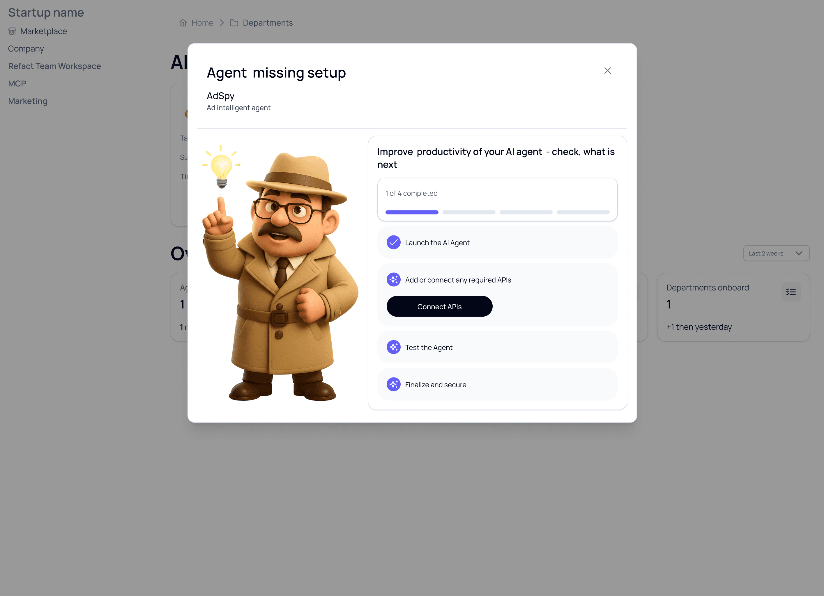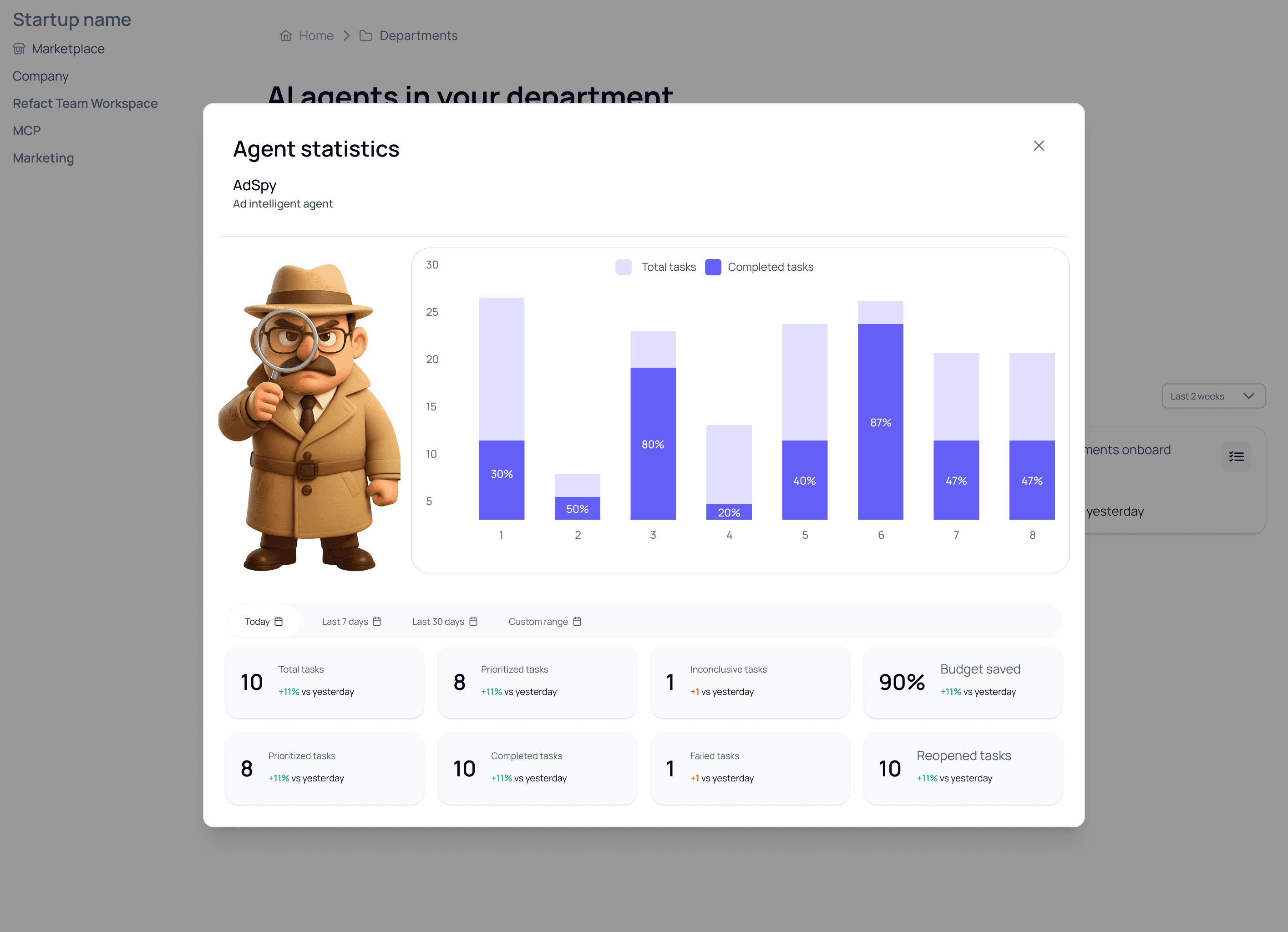 Мы провели исследование и выяснили: компании тратят до 5 часов в день на рутину, боятся «сложного AI» и хотят результата без настройки. На основе инсайтов я создала понятные флоу - выбор агента, его «найм» без кода и лёгкую статистику результатов. Дружелюбный визуальный язык, адаптированные дизайн-токены и воздушный UI помогли представить агентов не как инструмент, а как коллег, что резко снизило барьер входа.