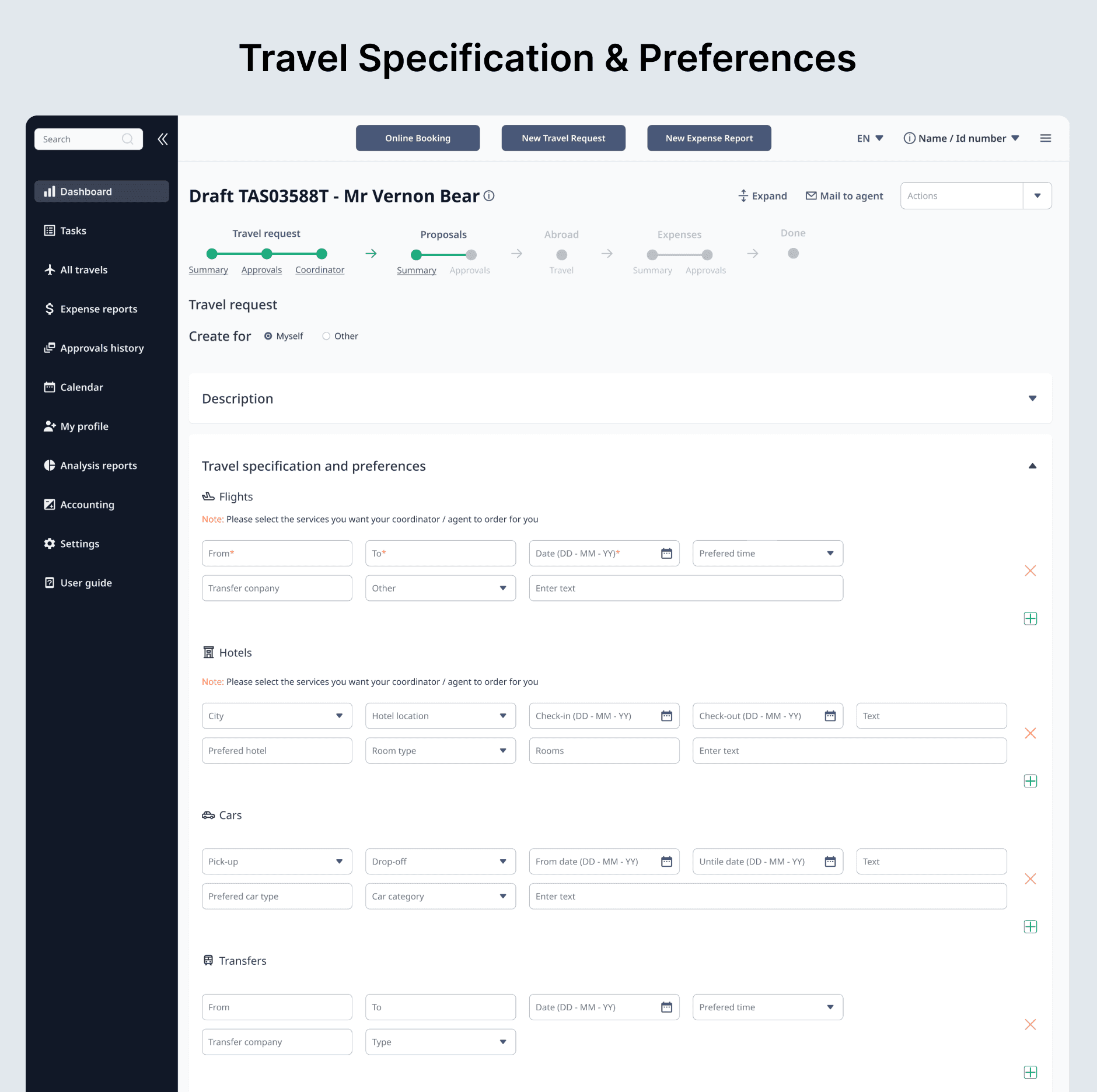 Моя задача была переосмыслить интерфейс, не меняя процессов. Я создала новую концепцию платформы: обновила логику навигации, ввела понятные статусы и шаги процесса, собрала современный UI-паттерн для форм и разработала полноценную дизайн-систему, которая одинаково корректно работала на английском и иврите. На базе системы я собрала и отрисовала 15 ключевых сценариев — от travel request до отчёта с прикреплёнными чеками и аналитики для финансовой команды.